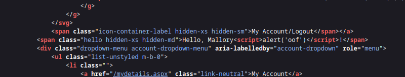 We’ll try Mallory<script>alert('oof')</script> to achieve this.