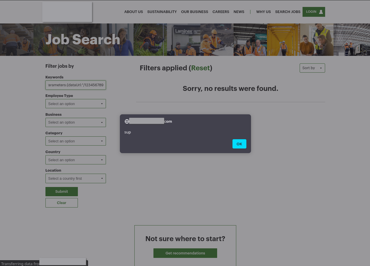 Take the above careers website, for example: searching for 123456789 and then viewing the source of the page we find that our search query is embedded in a JavaScript object which is, itself, embedded in a script tag.