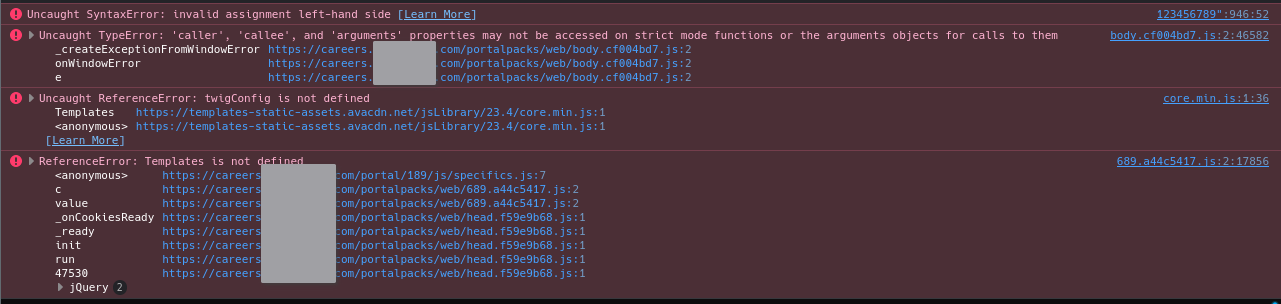 The eagle-eyed reader will notice that this isn’t valid JSON, and it’s also not valid JavaScript either. Because of this we get a bunch of errors on the page: