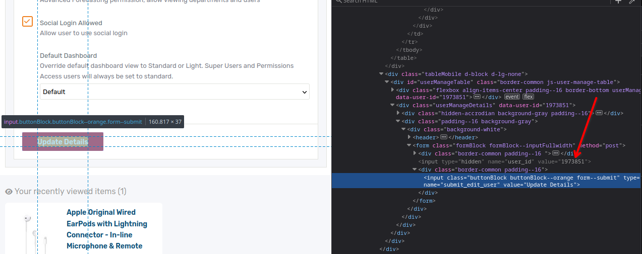 Right clicking the form (specifically the submit button) and inspecting the elements reveals a hidden field nearby with a user ID in it. We know what to do with this!
